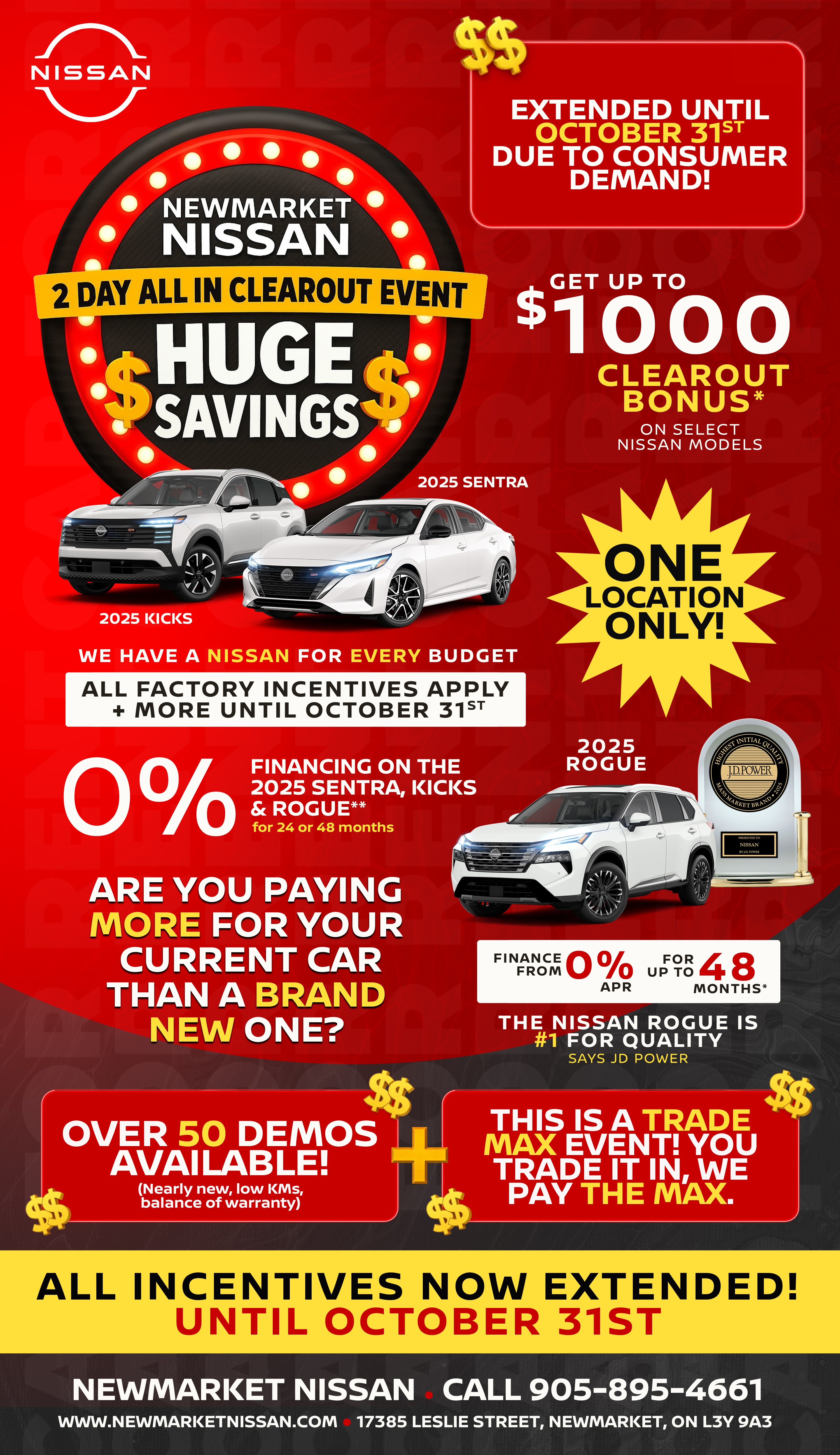 *Offers available from October 1, 2025 to October 31, 2025. *Representative finance offer based on a new 2025 Rogue S AWD. Selling Price is $ 35,867 financed at 0 % APR equals 48 monthly payments of $ 747 monthly for a 48 month term. $ 0 down payment required. Cost of borrowing is $ 0 for a total obligation of $ 35,867. Financing Bonus of $ 1000.0 is available on advertised offers for 2025 Rogue S AWD. 0.5% Loyalty Rate Reduction applies to new and previously unregistered 2025 Rogue models that are purchased or leased/financed (on approved credit) from an authorized Nissan dealer in Canada between October 1, 2025, and October 31, 2025. Offer subject to change or cancellation without notice.License, registration, insurance and applicable taxes are extra. Offers are available on approved credit through Nissan Canada Finance for a limited time, May change without notice. Retailers are free to set individual prices. Vehicles and accessories are for illustration purposes only.Comprised of $250 flat discount and up to $100 mail-in rebate. Tire manufacturer rebate amounts and effective dates vary by manufacturer. Please see dealer for rebate details. Eligible tires only. Certain restrictions apply. See dealer for details. Price and offer availability May vary by model. Nissan discount deducted before taxes. Tire manufacturer rebates are deducted after taxes. Taxes additional. No cash value. Must present offer to redeem. May not be combined with other offers. Nissan vehicles only. Void where prohibited.