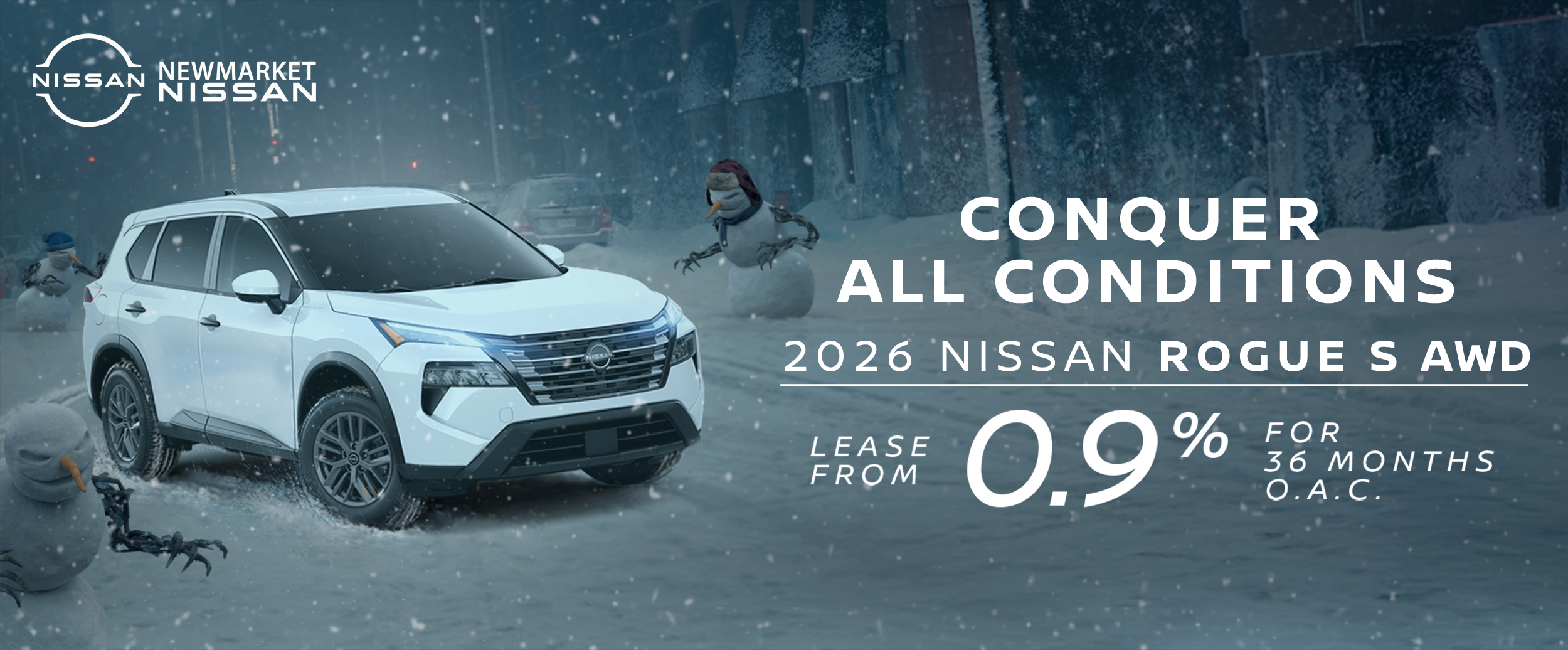 Rogue S: [*] Offers available from February 3, 2026 to March 2, 2026. Payments cannot be made on a weekly basis, for advertising purposes only.*Representative monthly lease offer based on a new 2026 Rogue S at 0.9% APR for 36 months equals monthly payments of $ 469 with $ 0 down payment, and $0 security deposit. Lease based on a maximum of 16,000 km/year with excess charged at $0.10/km. Total lease obligation is $ 16,931. Lease Bonus of $ 0 is included in the advertised offer.License, registration, insurance and applicable taxes are extra. Offers are available on approved credit through Nissan Canada Finance for a limited time, May change without notice. Retailers are free to set individual prices. Vehicles and accessories are for illustration purposes only.